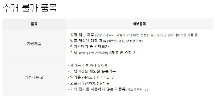 ◾ 설치(고정)된 제품은 서비스 이용 전 기본 철거가 되어 있어야 합니다. 에어컨, 벽걸이 TV, 빔프로젝터, 유무선공유기, 감시카메라 등 설치(고정)된 제품은 서비스 이용 전 기본 철거가 되어 있어야 수거가 가능하며, 태양광 패널은 콜센터를 통해 접수가 가능하며 기본 철거가 되어 있어야 합니다.
